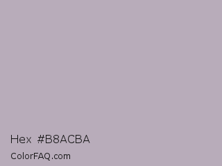 Hex #b8acba Color is a light purple color and the nearest color is Nobel #b7b1b1. Hex code #b8acba and RGB value is rgb(184,172,186). In RGB color space, this color is composed of 72% red, 67% green, 73% blue, In CMYK color space, this color is composed of 1% cyan, 8% magenta, 0% yellow , 27% black , In HSL color space, this color has a hue angle of 291° , 9% saturation and 70% lightness.