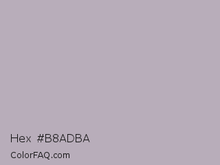 Hex #b8adba Color is a light purple color and the nearest color is Nobel #b7b1b1. Hex code #b8adba and RGB value is rgb(184,173,186). In RGB color space, this color is composed of 72% red, 68% green, 73% blue, In CMYK color space, this color is composed of 1% cyan, 7% magenta, 0% yellow , 27% black , In HSL color space, this color has a hue angle of 291° , 9% saturation and 70% lightness.