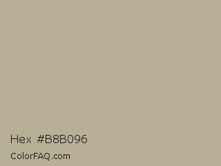 Hex #b8b096 Color is a light yellow color and the nearest color is Heathered Gray #b6b095. Hex code #b8b096 and RGB value is rgb(184,176,150). In RGB color space, this color is composed of 72% red, 69% green, 59% blue, In CMYK color space, this color is composed of 0% cyan, 4% magenta, 18% yellow , 28% black , In HSL color space, this color has a hue angle of 46° , 19% saturation and 65% lightness.