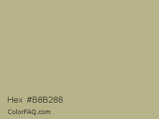 Hex #b8b288 Color is a light yellow color and the nearest color is Sage #bcb88a. Hex code #b8b288 and RGB value is rgb(184,178,136). In RGB color space, this color is composed of 72% red, 70% green, 53% blue, In CMYK color space, this color is composed of 0% cyan, 3% magenta, 26% yellow , 28% black , In HSL color space, this color has a hue angle of 53° , 25% saturation and 63% lightness.