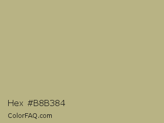 Hex #b8b384 Color is a light yellow color and the nearest color is Sage #bcb88a. Hex code #b8b384 and RGB value is rgb(184,179,132). In RGB color space, this color is composed of 72% red, 70% green, 52% blue, In CMYK color space, this color is composed of 0% cyan, 3% magenta, 28% yellow , 28% black , In HSL color space, this color has a hue angle of 54° , 27% saturation and 62% lightness.