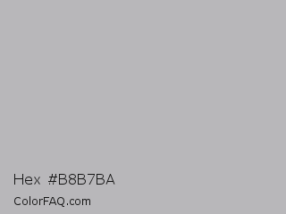 Hex #b8b7ba Color is a light indigo color and the nearest color is Pink Swan #beb5b7. Hex code #b8b7ba and RGB value is rgb(184,183,186). In RGB color space, this color is composed of 72% red, 72% green, 73% blue, In CMYK color space, this color is composed of 1% cyan, 2% magenta, 0% yellow , 27% black , In HSL color space, this color has a hue angle of 260° , 2% saturation and 72% lightness.