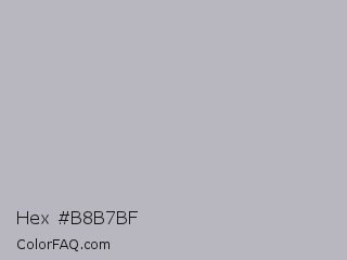 Hex #b8b7bf Color is a light indigo color and the nearest color is Gray X11 Gray #bebebe. Hex code #b8b7bf and RGB value is rgb(184,183,191). In RGB color space, this color is composed of 72% red, 72% green, 75% blue, In CMYK color space, this color is composed of 4% cyan, 4% magenta, 0% yellow , 25% black , In HSL color space, this color has a hue angle of 248° , 6% saturation and 73% lightness.
