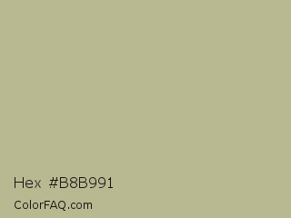 Hex #b8b991 Color is a light yellow color and the nearest color is Sage #bcb88a. Hex code #b8b991 and RGB value is rgb(184,185,145). In RGB color space, this color is composed of 72% red, 73% green, 57% blue, In CMYK color space, this color is composed of 1% cyan, 0% magenta, 22% yellow , 27% black , In HSL color space, this color has a hue angle of 62° , 22% saturation and 65% lightness.