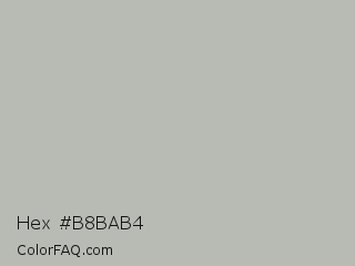 Hex #b8bab4 Color is a light green color and the nearest color is Ash Gray #b2beb5. Hex code #b8bab4 and RGB value is rgb(184,186,180). In RGB color space, this color is composed of 72% red, 73% green, 71% blue, In CMYK color space, this color is composed of 1% cyan, 0% magenta, 3% yellow , 27% black , In HSL color space, this color has a hue angle of 80° , 4% saturation and 72% lightness.