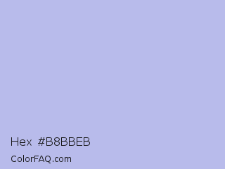 Hex #b8bbeb Color is a very light blue color and the nearest color is Perano #a9bef2. Hex code #b8bbeb and RGB value is rgb(184,187,235). In RGB color space, this color is composed of 72% red, 73% green, 92% blue, In CMYK color space, this color is composed of 22% cyan, 20% magenta, 0% yellow , 8% black , In HSL color space, this color has a hue angle of 236° , 56% saturation and 82% lightness.