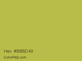 Hex #b8bd49 Color is a normal yellow color and the nearest color is Turmeric #cabb48. Hex code #b8bd49 and RGB value is rgb(184,189,73). In RGB color space, this color is composed of 72% red, 74% green, 29% blue, In CMYK color space, this color is composed of 3% cyan, 0% magenta, 61% yellow , 26% black , In HSL color space, this color has a hue angle of 63° , 47% saturation and 51% lightness.