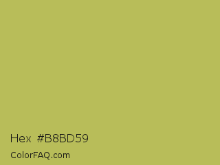 Hex #b8bd59 Color is a normal yellow color and the nearest color is Celery #b8c25d. Hex code #b8bd59 and RGB value is rgb(184,189,89). In RGB color space, this color is composed of 72% red, 74% green, 35% blue, In CMYK color space, this color is composed of 3% cyan, 0% magenta, 53% yellow , 26% black , In HSL color space, this color has a hue angle of 63° , 43% saturation and 55% lightness.