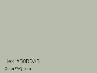 Hex #b8bdab Color is a light lime color and the nearest color is Green Spring #b8c1b1. Hex code #b8bdab and RGB value is rgb(184,189,171). In RGB color space, this color is composed of 72% red, 74% green, 67% blue, In CMYK color space, this color is composed of 3% cyan, 0% magenta, 10% yellow , 26% black , In HSL color space, this color has a hue angle of 77° , 12% saturation and 71% lightness.