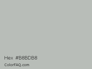 Hex #b8bdb8 Color is a light green color and the nearest color is Ash Gray #b2beb5. Hex code #b8bdb8 and RGB value is rgb(184,189,184). In RGB color space, this color is composed of 72% red, 74% green, 72% blue, In CMYK color space, this color is composed of 3% cyan, 0% magenta, 3% yellow , 26% black , In HSL color space, this color has a hue angle of 120° , 4% saturation and 73% lightness.