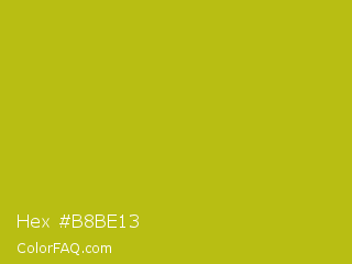 Hex #b8be13 Color is a normal yellow color and the nearest color is La Rioja #b3c110. Hex code #b8be13 and RGB value is rgb(184,190,19). In RGB color space, this color is composed of 72% red, 75% green, 7% blue, In CMYK color space, this color is composed of 3% cyan, 0% magenta, 90% yellow , 25% black , In HSL color space, this color has a hue angle of 62° , 82% saturation and 41% lightness.