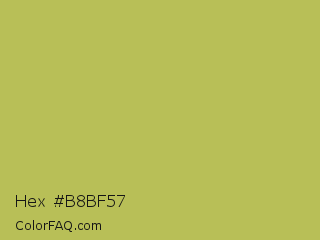 Hex #b8bf57 Color is a normal yellow color and the nearest color is Celery #b8c25d. Hex code #b8bf57 and RGB value is rgb(184,191,87). In RGB color space, this color is composed of 72% red, 75% green, 34% blue, In CMYK color space, this color is composed of 4% cyan, 0% magenta, 54% yellow , 25% black , In HSL color space, this color has a hue angle of 64° , 45% saturation and 55% lightness.