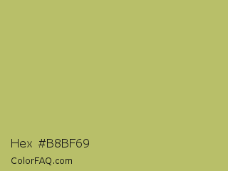 Hex #b8bf69 Color is a normal yellow color and the nearest color is Wild Willow #b9c46a. Hex code #b8bf69 and RGB value is rgb(184,191,105). In RGB color space, this color is composed of 72% red, 75% green, 41% blue, In CMYK color space, this color is composed of 4% cyan, 0% magenta, 45% yellow , 25% black , In HSL color space, this color has a hue angle of 65° , 40% saturation and 58% lightness.