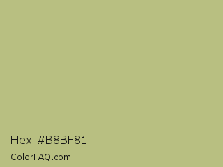 Hex #b8bf81 Color is a light yellow color and the nearest color is Sage #bcb88a. Hex code #b8bf81 and RGB value is rgb(184,191,129). In RGB color space, this color is composed of 72% red, 75% green, 51% blue, In CMYK color space, this color is composed of 4% cyan, 0% magenta, 32% yellow , 25% black , In HSL color space, this color has a hue angle of 67° , 33% saturation and 63% lightness.
