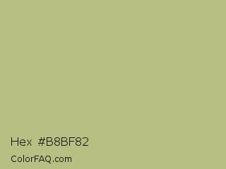 Hex #b8bf82 Color is a light yellow color and the nearest color is Sage #bcb88a. Hex code #b8bf82 and RGB value is rgb(184,191,130). In RGB color space, this color is composed of 72% red, 75% green, 51% blue, In CMYK color space, this color is composed of 4% cyan, 0% magenta, 32% yellow , 25% black , In HSL color space, this color has a hue angle of 67° , 32% saturation and 63% lightness.