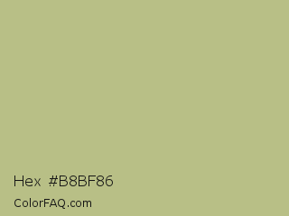 Hex #b8bf86 Color is a light yellow color and the nearest color is Sage #bcb88a. Hex code #b8bf86 and RGB value is rgb(184,191,134). In RGB color space, this color is composed of 72% red, 75% green, 53% blue, In CMYK color space, this color is composed of 4% cyan, 0% magenta, 30% yellow , 25% black , In HSL color space, this color has a hue angle of 67° , 31% saturation and 64% lightness.