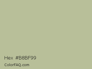 Hex #b8bf99 Color is a light lime color and the nearest color is Eagle #b6baa4. Hex code #b8bf99 and RGB value is rgb(184,191,153). In RGB color space, this color is composed of 72% red, 75% green, 60% blue, In CMYK color space, this color is composed of 4% cyan, 0% magenta, 20% yellow , 25% black , In HSL color space, this color has a hue angle of 71° , 23% saturation and 67% lightness.