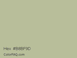 Hex #b8bf9d Color is a light lime color and the nearest color is Eagle #b6baa4. Hex code #b8bf9d and RGB value is rgb(184,191,157). In RGB color space, this color is composed of 72% red, 75% green, 62% blue, In CMYK color space, this color is composed of 4% cyan, 0% magenta, 18% yellow , 25% black , In HSL color space, this color has a hue angle of 72° , 21% saturation and 68% lightness.