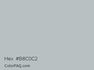Hex #b8c0c2 Color is a light cyan color and the nearest color is Silver Sand #bfc1c2. Hex code #b8c0c2 and RGB value is rgb(184,192,194). In RGB color space, this color is composed of 72% red, 75% green, 76% blue, In CMYK color space, this color is composed of 5% cyan, 1% magenta, 0% yellow , 24% black , In HSL color space, this color has a hue angle of 192° , 8% saturation and 74% lightness.