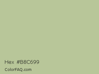 Hex #b8c699 Color is a light lime color and the nearest color is Eagle #b6baa4. Hex code #b8c699 and RGB value is rgb(184,198,153). In RGB color space, this color is composed of 72% red, 78% green, 60% blue, In CMYK color space, this color is composed of 7% cyan, 0% magenta, 23% yellow , 22% black , In HSL color space, this color has a hue angle of 79° , 28% saturation and 69% lightness.