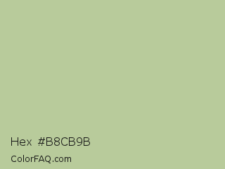 Hex #b8cb9b Color is a light green color and the nearest color is Rainee #b9c8ac. Hex code #b8cb9b and RGB value is rgb(184,203,155). In RGB color space, this color is composed of 72% red, 80% green, 61% blue, In CMYK color space, this color is composed of 9% cyan, 0% magenta, 24% yellow , 20% black , In HSL color space, this color has a hue angle of 84° , 32% saturation and 70% lightness.