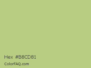 Hex #b8cd81 Color is a light lime color and the nearest color is Pine Glade #c7cd90. Hex code #b8cd81 and RGB value is rgb(184,205,129). In RGB color space, this color is composed of 72% red, 80% green, 51% blue, In CMYK color space, this color is composed of 10% cyan, 0% magenta, 37% yellow , 20% black , In HSL color space, this color has a hue angle of 77° , 43% saturation and 65% lightness.