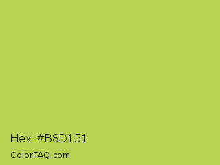 Hex #b8d151 Color is a normal lime color and the nearest color is June Bud #bdda57. Hex code #b8d151 and RGB value is rgb(184,209,81). In RGB color space, this color is composed of 72% red, 82% green, 32% blue, In CMYK color space, this color is composed of 12% cyan, 0% magenta, 61% yellow , 18% black , In HSL color space, this color has a hue angle of 72° , 58% saturation and 57% lightness.