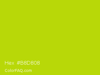 Hex #b8d808 Color is a normal yellow color and the nearest color is Rio Grande #bbd009. Hex code #b8d808 and RGB value is rgb(184,216,8). In RGB color space, this color is composed of 72% red, 85% green, 3% blue, In CMYK color space, this color is composed of 15% cyan, 0% magenta, 96% yellow , 15% black , In HSL color space, this color has a hue angle of 69° , 93% saturation and 44% lightness.