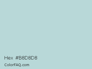 Hex #b8d8d8 Color is a light cyan color and the nearest color is Jungle Mist #b4cfd3. Hex code #b8d8d8 and RGB value is rgb(184,216,216). In RGB color space, this color is composed of 72% red, 85% green, 85% blue, In CMYK color space, this color is composed of 15% cyan, 0% magenta, 0% yellow , 15% black , In HSL color space, this color has a hue angle of 180° , 29% saturation and 78% lightness.
