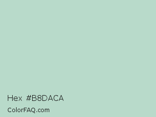 Hex #b8daca Color is a light green color and the nearest color is Jet Stream #b5d2ce. Hex code #b8daca and RGB value is rgb(184,218,202). In RGB color space, this color is composed of 72% red, 85% green, 79% blue, In CMYK color space, this color is composed of 16% cyan, 0% magenta, 7% yellow , 15% black , In HSL color space, this color has a hue angle of 152° , 31% saturation and 79% lightness.