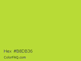 Hex #b8db36 Color is a normal lime color and the nearest color is Conifer #acdd4d. Hex code #b8db36 and RGB value is rgb(184,219,54). In RGB color space, this color is composed of 72% red, 86% green, 21% blue, In CMYK color space, this color is composed of 16% cyan, 0% magenta, 75% yellow , 14% black , In HSL color space, this color has a hue angle of 73° , 70% saturation and 54% lightness.