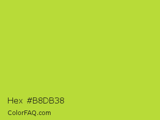 Hex #b8db38 Color is a normal lime color and the nearest color is Conifer #acdd4d. Hex code #b8db38 and RGB value is rgb(184,219,56). In RGB color space, this color is composed of 72% red, 86% green, 22% blue, In CMYK color space, this color is composed of 16% cyan, 0% magenta, 74% yellow , 14% black , In HSL color space, this color has a hue angle of 73° , 69% saturation and 54% lightness.