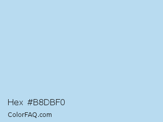 Hex #b8dbf0 Color is a very light blue color and the nearest color is Sail #b8e0f9. Hex code #b8dbf0 and RGB value is rgb(184,219,240). In RGB color space, this color is composed of 72% red, 86% green, 94% blue, In CMYK color space, this color is composed of 23% cyan, 9% magenta, 0% yellow , 6% black , In HSL color space, this color has a hue angle of 203° , 65% saturation and 83% lightness.