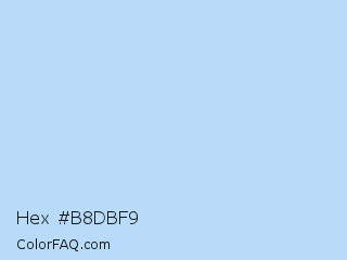 Hex #b8dbf9 Color is a very light blue color and the nearest color is Sail #b8e0f9. Hex code #b8dbf9 and RGB value is rgb(184,219,249). In RGB color space, this color is composed of 72% red, 86% green, 98% blue, In CMYK color space, this color is composed of 26% cyan, 12% magenta, 0% yellow , 2% black , In HSL color space, this color has a hue angle of 208° , 84% saturation and 85% lightness.