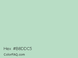 Hex #b8ddc5 Color is a light green color and the nearest color is Surf #bbd7c1. Hex code #b8ddc5 and RGB value is rgb(184,221,197). In RGB color space, this color is composed of 72% red, 87% green, 77% blue, In CMYK color space, this color is composed of 17% cyan, 0% magenta, 11% yellow , 13% black , In HSL color space, this color has a hue angle of 141° , 35% saturation and 79% lightness.