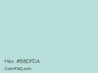 Hex #b8dfda Color is a light cyan color and the nearest color is Ziggurat #bfdbe2. Hex code #b8dfda and RGB value is rgb(184,223,218). In RGB color space, this color is composed of 72% red, 87% green, 85% blue, In CMYK color space, this color is composed of 17% cyan, 0% magenta, 2% yellow , 13% black , In HSL color space, this color has a hue angle of 172° , 38% saturation and 80% lightness.