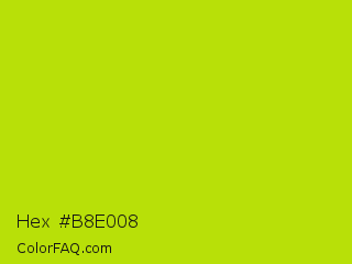 Hex #b8e008 Color is a normal lime color and the nearest color is Fuego #bede0d. Hex code #b8e008 and RGB value is rgb(184,224,8). In RGB color space, this color is composed of 72% red, 88% green, 3% blue, In CMYK color space, this color is composed of 18% cyan, 0% magenta, 96% yellow , 12% black , In HSL color space, this color has a hue angle of 71° , 93% saturation and 45% lightness.