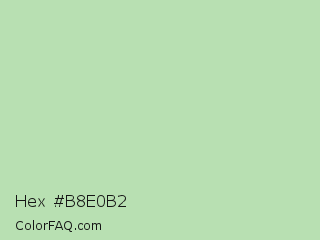 Hex #b8e0b2 Color is a light green color and the nearest color is Pixie Green #c0d8b6. Hex code #b8e0b2 and RGB value is rgb(184,224,178). In RGB color space, this color is composed of 72% red, 88% green, 70% blue, In CMYK color space, this color is composed of 18% cyan, 0% magenta, 21% yellow , 12% black , In HSL color space, this color has a hue angle of 112° , 43% saturation and 79% lightness.