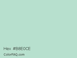 Hex #b8e0ce Color is a light green color and the nearest color is Jet Stream #b5d2ce. Hex code #b8e0ce and RGB value is rgb(184,224,206). In RGB color space, this color is composed of 72% red, 88% green, 81% blue, In CMYK color space, this color is composed of 18% cyan, 0% magenta, 8% yellow , 12% black , In HSL color space, this color has a hue angle of 153° , 39% saturation and 80% lightness.
