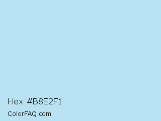 Hex #b8e2f1 Color is a very light blue color and the nearest color is Sail #b8e0f9. Hex code #b8e2f1 and RGB value is rgb(184,226,241). In RGB color space, this color is composed of 72% red, 89% green, 95% blue, In CMYK color space, this color is composed of 24% cyan, 6% magenta, 0% yellow , 5% black , In HSL color space, this color has a hue angle of 196° , 67% saturation and 83% lightness.