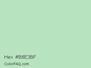 Hex #b8e3bf Color is a very light green color and the nearest color is Fringy Flower #b1e2c1. Hex code #b8e3bf and RGB value is rgb(184,227,191). In RGB color space, this color is composed of 72% red, 89% green, 75% blue, In CMYK color space, this color is composed of 19% cyan, 0% magenta, 16% yellow , 11% black , In HSL color space, this color has a hue angle of 130° , 43% saturation and 81% lightness.