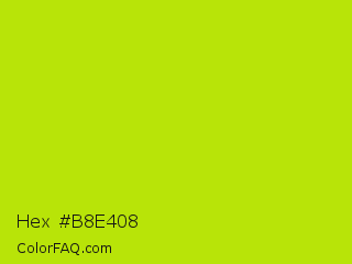 Hex #b8e408 Color is a normal lime color and the nearest color is Fuego #bede0d. Hex code #b8e408 and RGB value is rgb(184,228,8). In RGB color space, this color is composed of 72% red, 89% green, 3% blue, In CMYK color space, this color is composed of 19% cyan, 0% magenta, 96% yellow , 11% black , In HSL color space, this color has a hue angle of 72° , 93% saturation and 46% lightness.