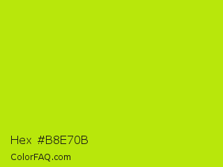 Hex #b8e70b Color is a normal lime color and the nearest color is Fuego #bede0d. Hex code #b8e70b and RGB value is rgb(184,231,11). In RGB color space, this color is composed of 72% red, 91% green, 4% blue, In CMYK color space, this color is composed of 20% cyan, 0% magenta, 95% yellow , 9% black , In HSL color space, this color has a hue angle of 73° , 91% saturation and 47% lightness.
