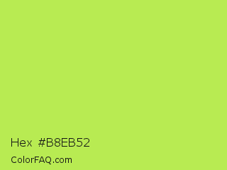 Hex #b8eb52 Color is a light green color and the nearest color is Inchworm #b2ec5d. Hex code #b8eb52 and RGB value is rgb(184,235,82). In RGB color space, this color is composed of 72% red, 92% green, 32% blue, In CMYK color space, this color is composed of 22% cyan, 0% magenta, 65% yellow , 8% black , In HSL color space, this color has a hue angle of 80° , 79% saturation and 62% lightness.