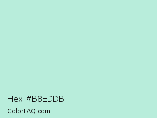 Hex #b8eddb Color is a very light green color and the nearest color is Cruise #b5ecdf. Hex code #b8eddb and RGB value is rgb(184,237,219). In RGB color space, this color is composed of 72% red, 93% green, 86% blue, In CMYK color space, this color is composed of 22% cyan, 0% magenta, 8% yellow , 7% black , In HSL color space, this color has a hue angle of 160° , 60% saturation and 83% lightness.