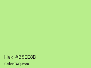 Hex #b8ee8b Color is a light green color and the nearest color is Sulu #c1f07c. Hex code #b8ee8b and RGB value is rgb(184,238,139). In RGB color space, this color is composed of 72% red, 93% green, 55% blue, In CMYK color space, this color is composed of 23% cyan, 0% magenta, 42% yellow , 7% black , In HSL color space, this color has a hue angle of 93° , 74% saturation and 74% lightness.