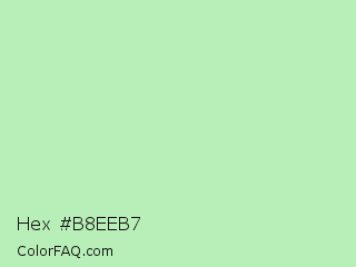 Hex #b8eeb7 Color is a very light green color and the nearest color is Madang #b7f0be. Hex code #b8eeb7 and RGB value is rgb(184,238,183). In RGB color space, this color is composed of 72% red, 93% green, 72% blue, In CMYK color space, this color is composed of 23% cyan, 0% magenta, 23% yellow , 7% black , In HSL color space, this color has a hue angle of 119° , 62% saturation and 83% lightness.