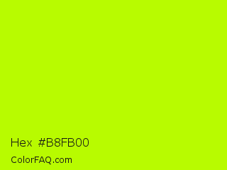 Hex #b8fb00 Color is a normal lime color and the nearest color is Lime #bfff00. Hex code #b8fb00 and RGB value is rgb(184,251,0). In RGB color space, this color is composed of 72% red, 98% green, 0% blue, In CMYK color space, this color is composed of 27% cyan, 0% magenta, 100% yellow , 2% black , In HSL color space, this color has a hue angle of 76° , 100% saturation and 49% lightness.