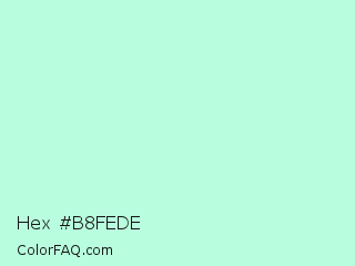 Hex #b8fede Color is a very light green color and the nearest color is Ice Cold #b1f4e7. Hex code #b8fede and RGB value is rgb(184,254,222). In RGB color space, this color is composed of 72% red, 100% green, 87% blue, In CMYK color space, this color is composed of 28% cyan, 0% magenta, 13% yellow , 0% black , In HSL color space, this color has a hue angle of 153° , 97% saturation and 86% lightness.