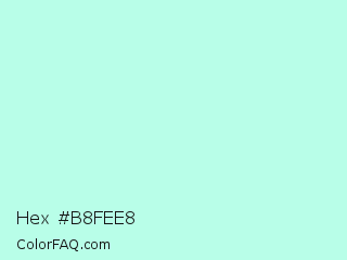 Hex #b8fee8 Color is a very light green color and the nearest color is Ice Cold #b1f4e7. Hex code #b8fee8 and RGB value is rgb(184,254,232). In RGB color space, this color is composed of 72% red, 100% green, 91% blue, In CMYK color space, this color is composed of 28% cyan, 0% magenta, 9% yellow , 0% black , In HSL color space, this color has a hue angle of 161° , 97% saturation and 86% lightness.